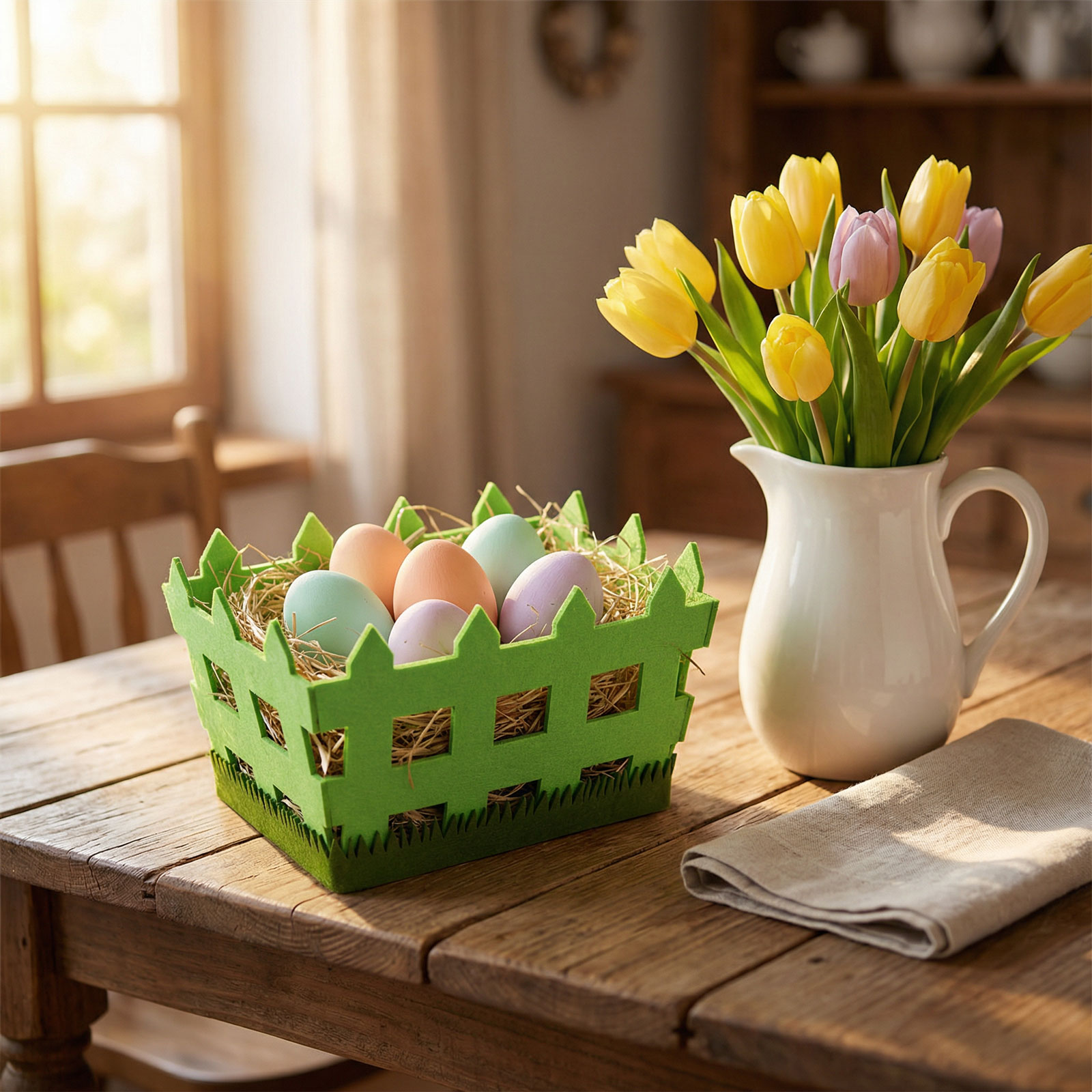 Dobja fel húsvéti dekorációját ezzel az egyedi, kerítés formájú filc kosárral! A kosár ideális édességek, apró ajándékok vagy húsvéti tojások tárolására és kínálására. A filc anyag könnyű, mégis tartós, a kerítés forma pedig vidám és tavaszi hangulatot varázsol. Tökéletes kiegészítője lehet az ünnepi asztalnak, ajándékkosaraknak vagy bármely húsvéti dekorációnak.