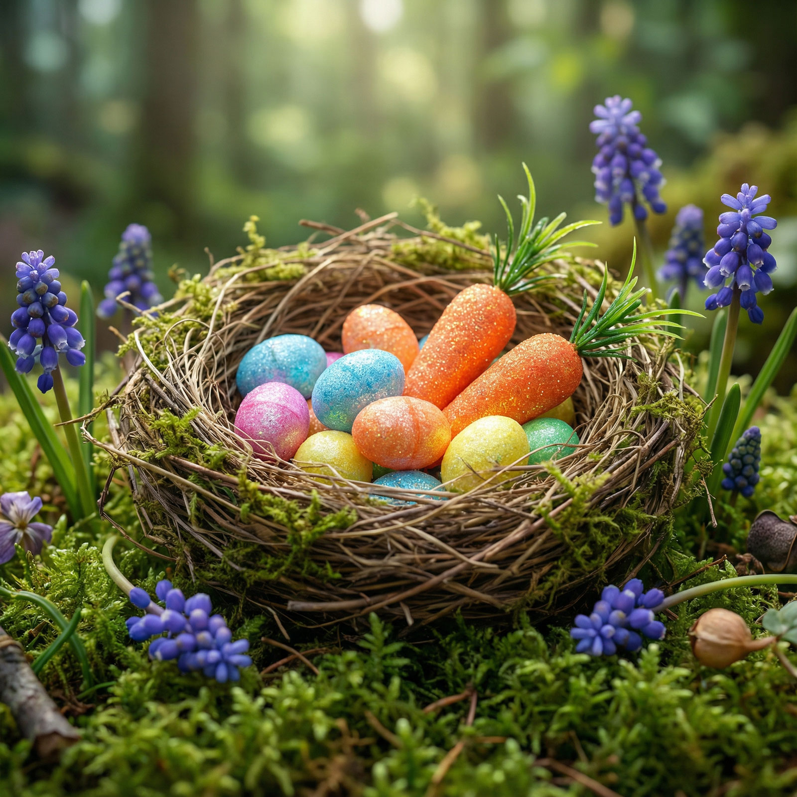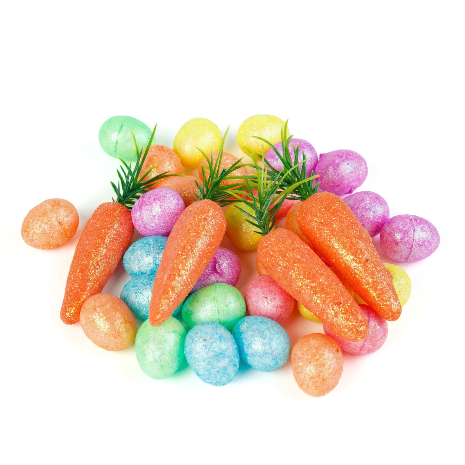 Dobja fel otthonát a tavasz és a húsvét vidám hangulatával ezzel a csillámos húsvéti dekoráció szettel! A csomag összesen 36 darab szivacsból készült díszt tartalmaz: 32 apró tojást és 4 darab nagyobb répát. A tojások és a répák színes, csillámos bevonattal készültek, így igazán ünnepivé varázsolják a kompozíciókat.