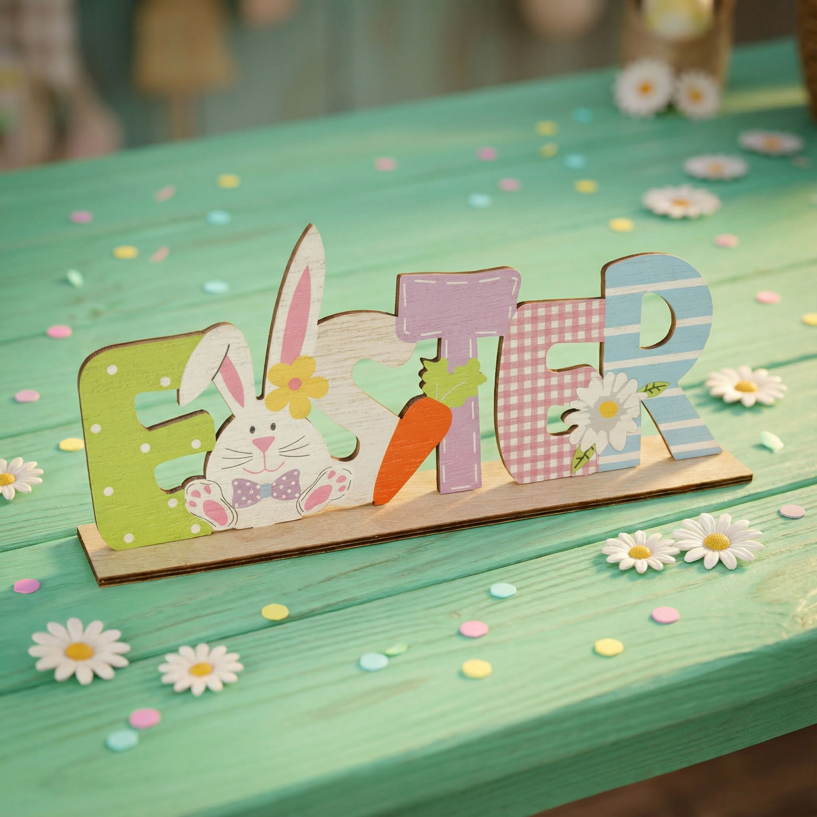 Dobja fel ünnepi asztalát ezzel a vidám, nyuszis húsvéti dekorációval! A fából készült fekvő asztaldísz színes betűkkel formázza az „EASTER” feliratot, amelyet aranyos nyuszi, répa és tavaszi virágok díszítenek. A dekoráció könnyedén elhelyezhető asztalon, polcon vagy komódon, és azonnal ünnepi hangulatot teremt otthonában. Tartós fa anyagának köszönhetően hosszú ideig megőrzi szépségét, így évről évre újra felhasználható.