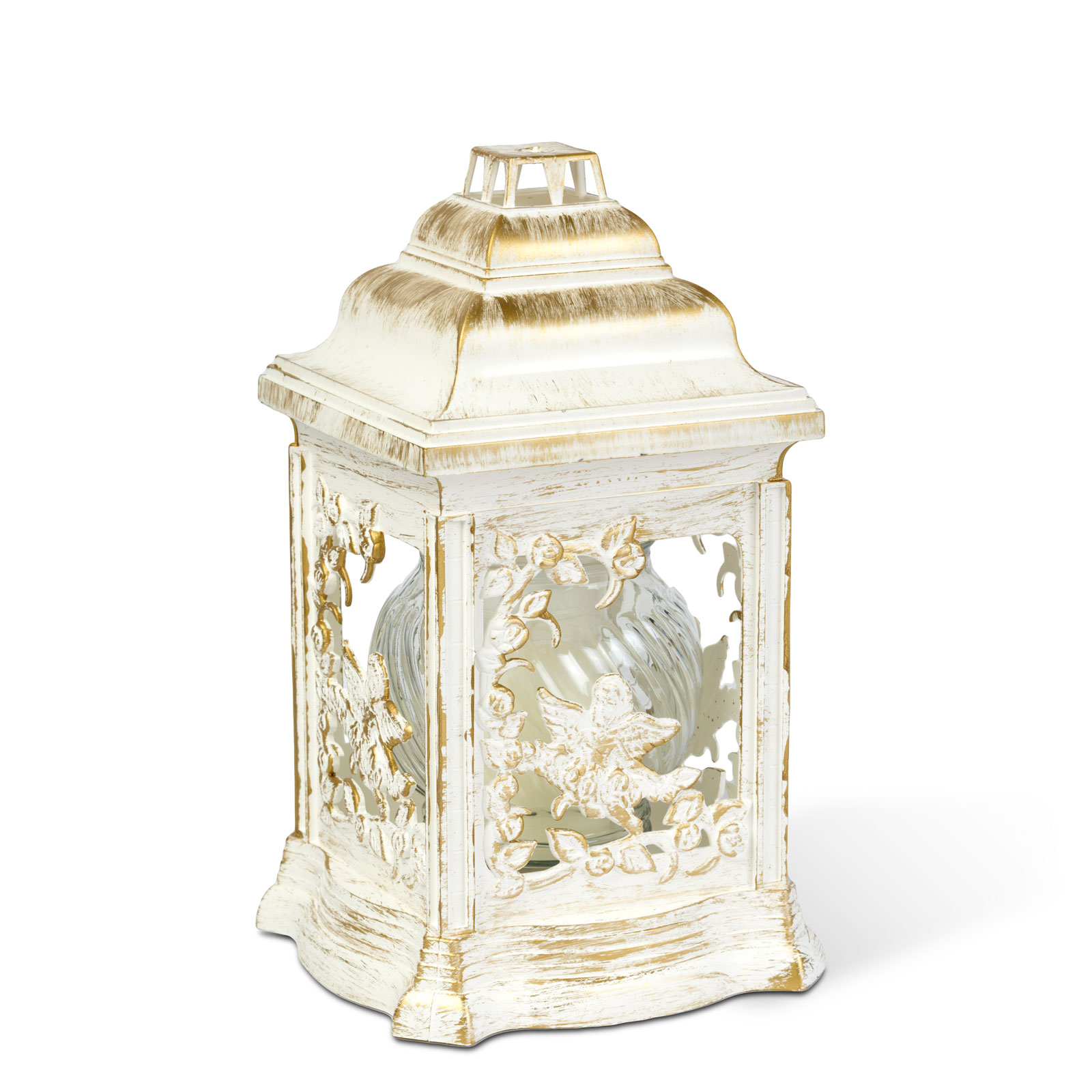Műanyag katedra mécses – angyalos mintával, belül üveg mécsessel, szín: fehér – arany antik – 25 cm