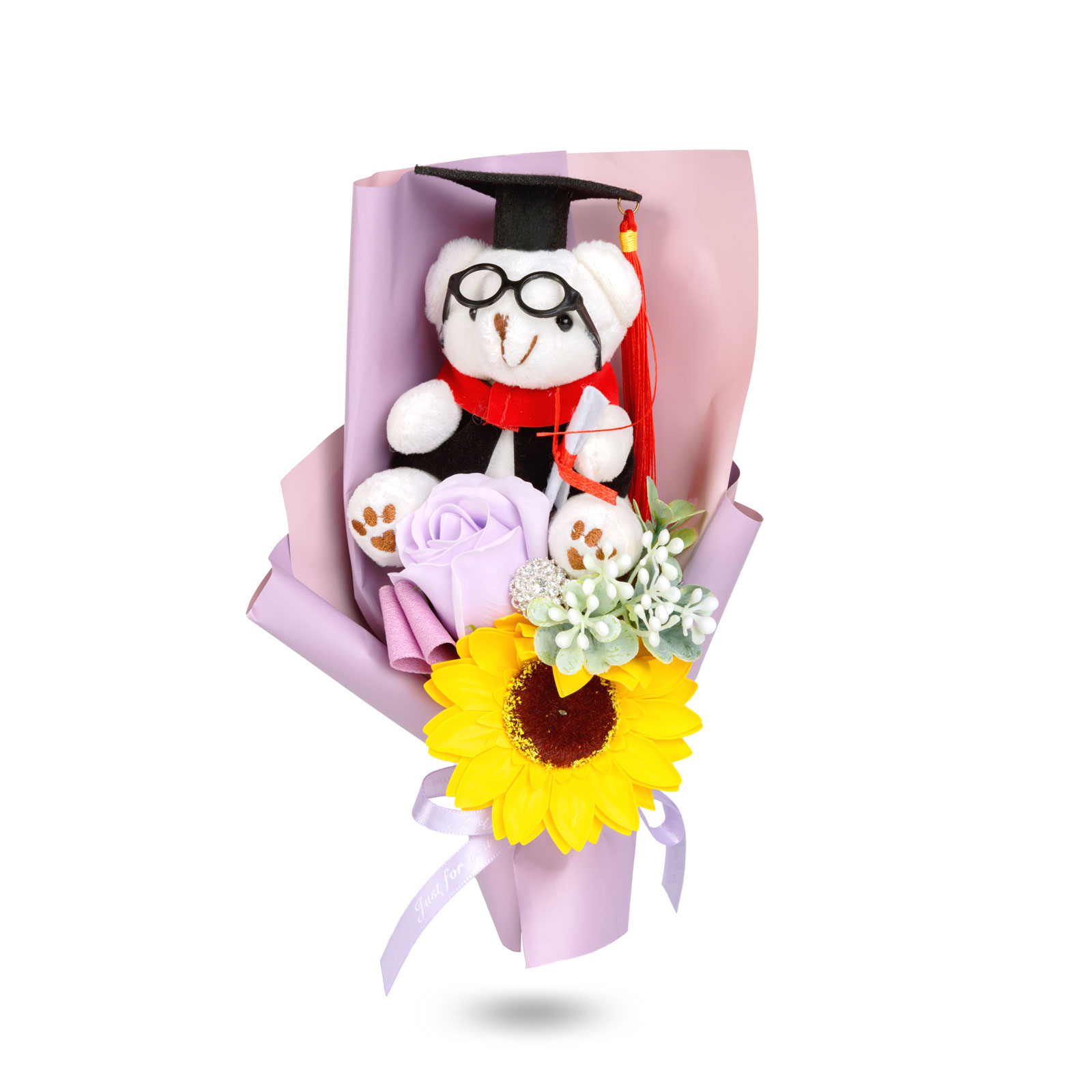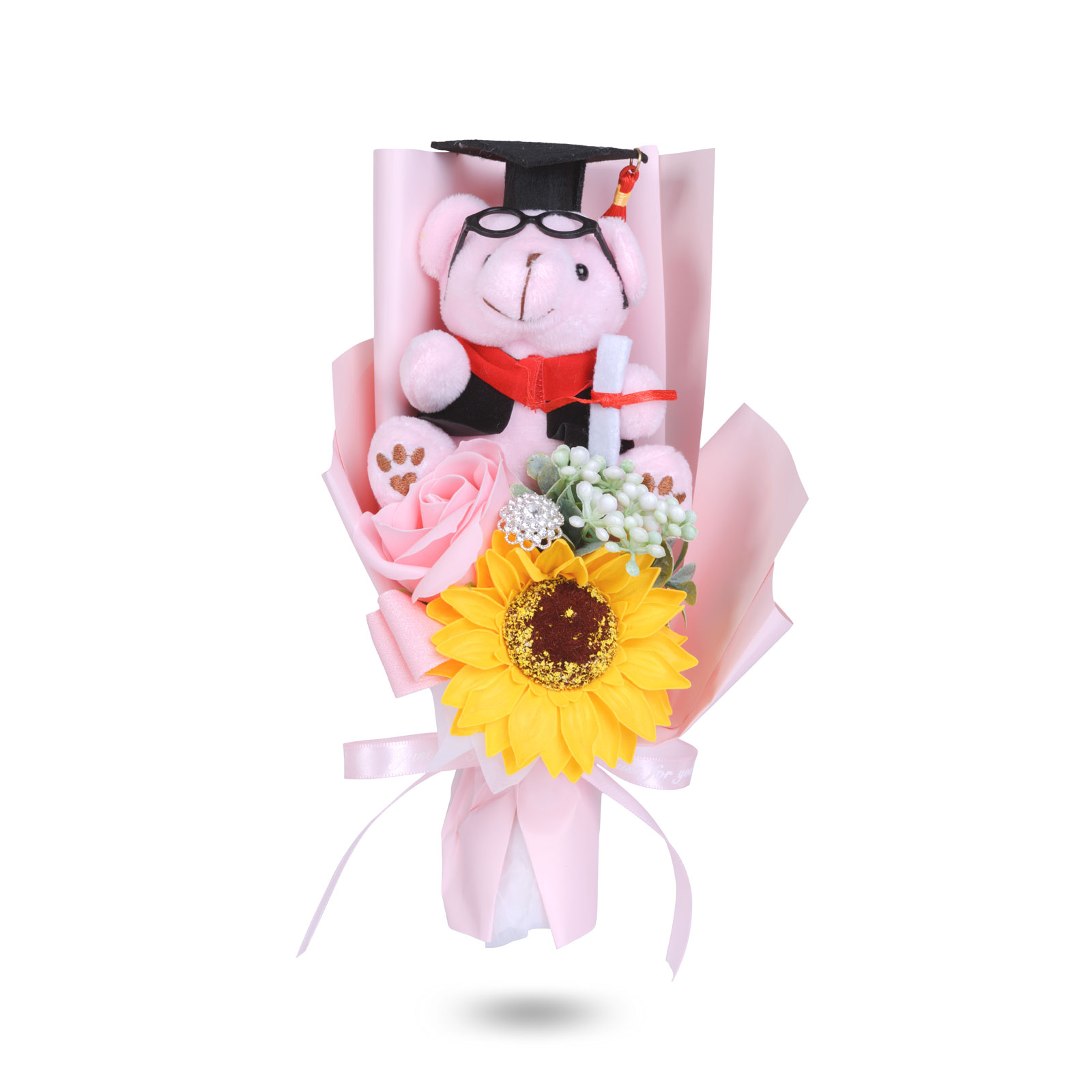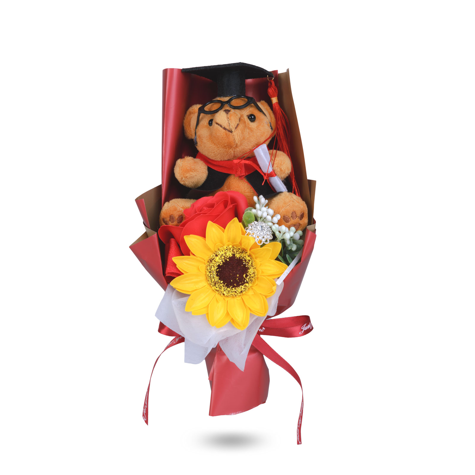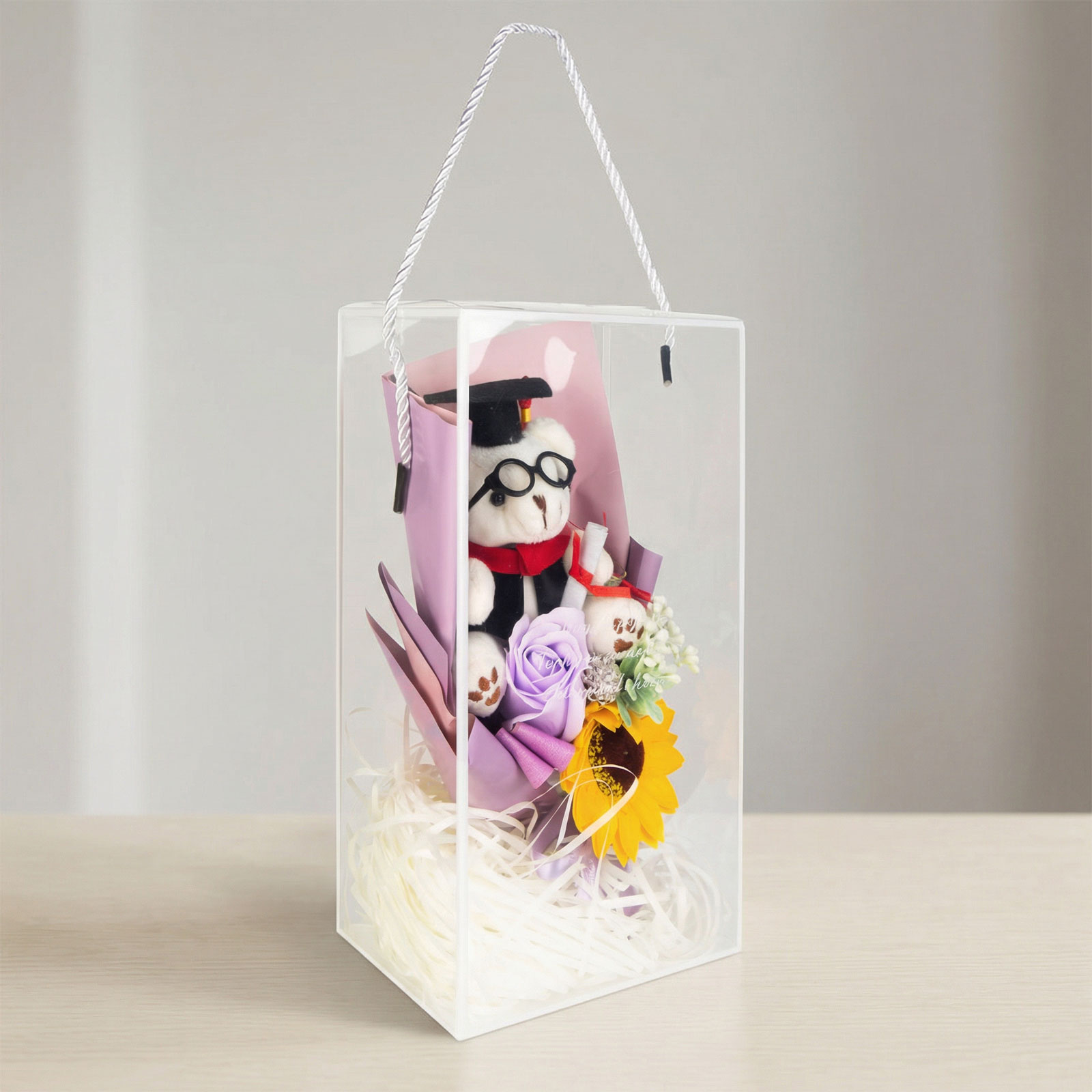 Egyedi és látványos ajándék, amely tökéletes választás ballagásra, diplomaosztóra vagy bármilyen ünnepi alkalomra. Az átlátszó díszdobozban elhelyezett dekoráció egy kedves diplomás macit, egy élethű napraforgót és elegáns díszítőelemeket tartalmaz, így azonnal átadható, külön csomagolást nem igényel. A harmonikusan összeválogatott színek és a részletgazdag kidolgozás igazán különlegessé teszik.