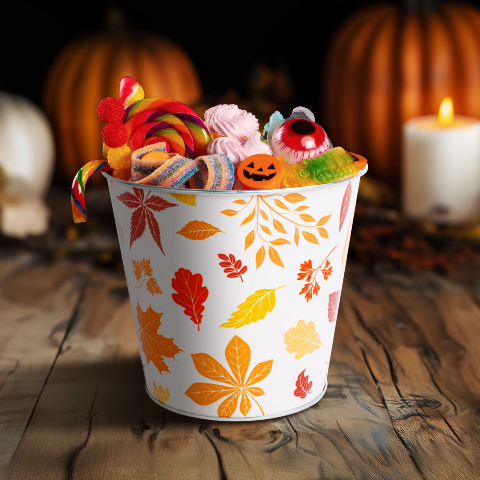 Dobja fel otthonát ezzel a hangulatos őszi dekorációval! A falevél mintával díszített fém vödör tökéletes kiegészítője lehet az őszi asztali dekorációnak, Halloween tematikájú díszítésnek vagy akár egy kreatív ajándéknak. Stílusa és meleg színvilága kellemes őszi hangulatot teremt bármely helyiségben.