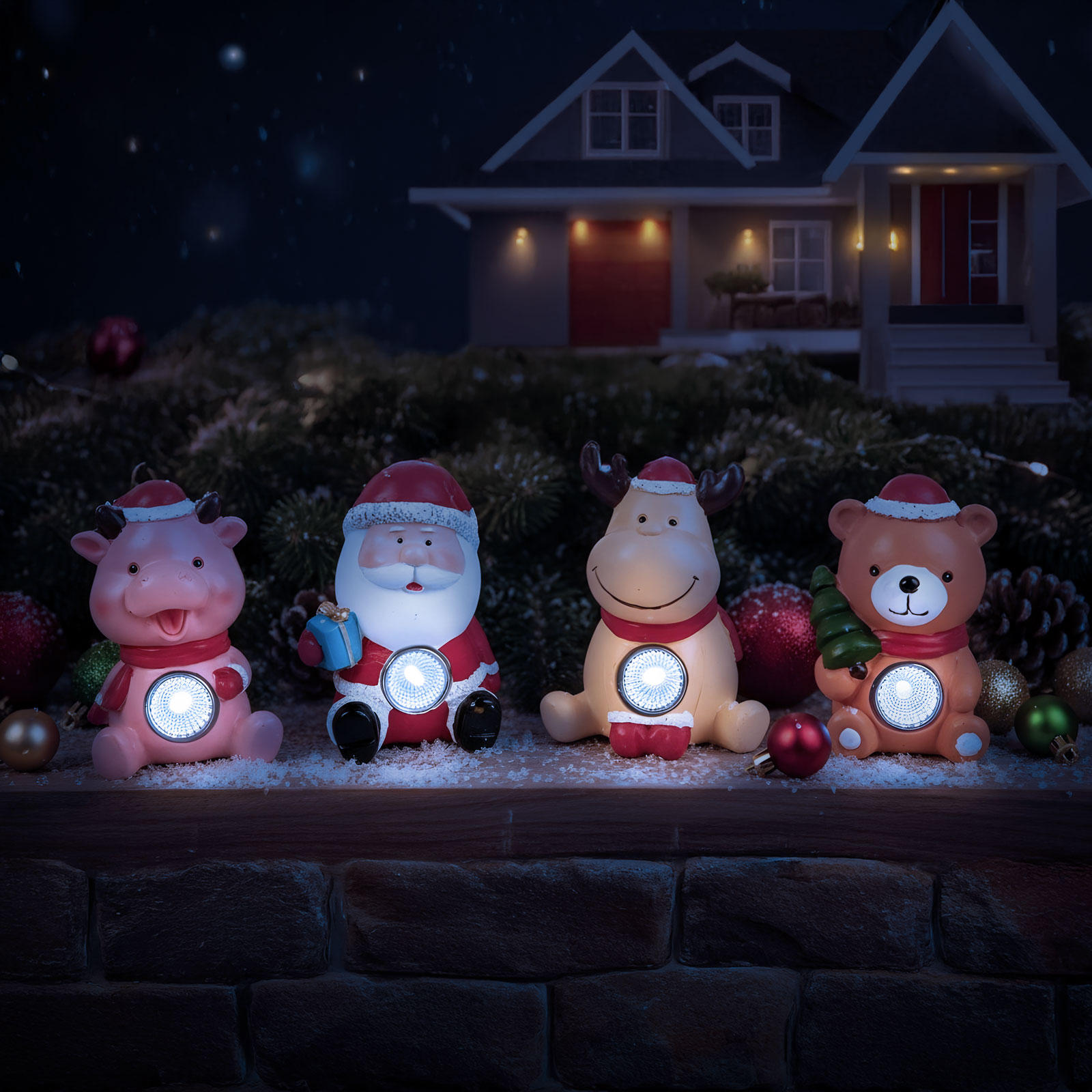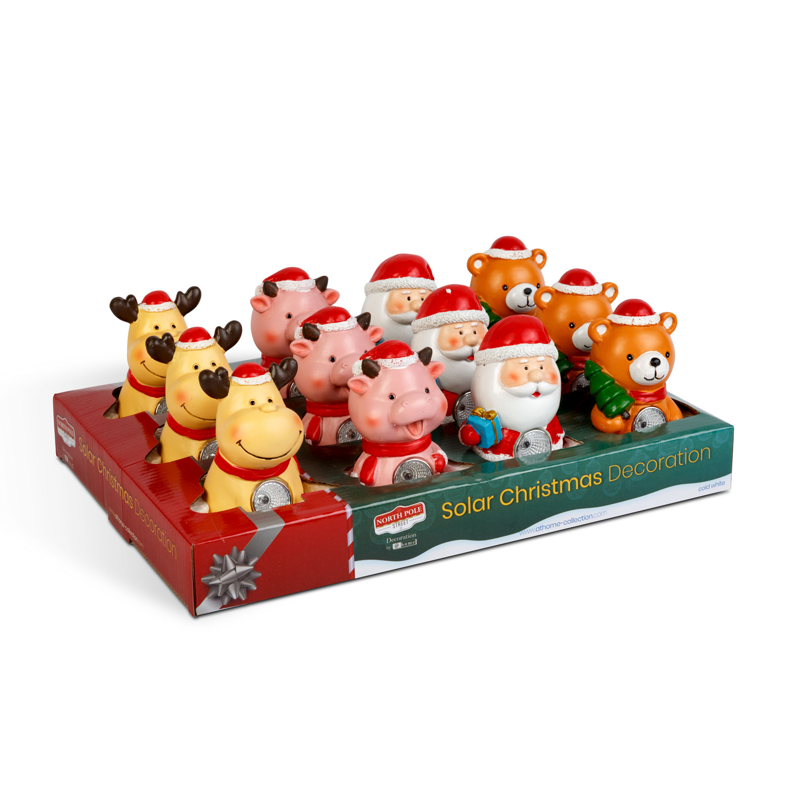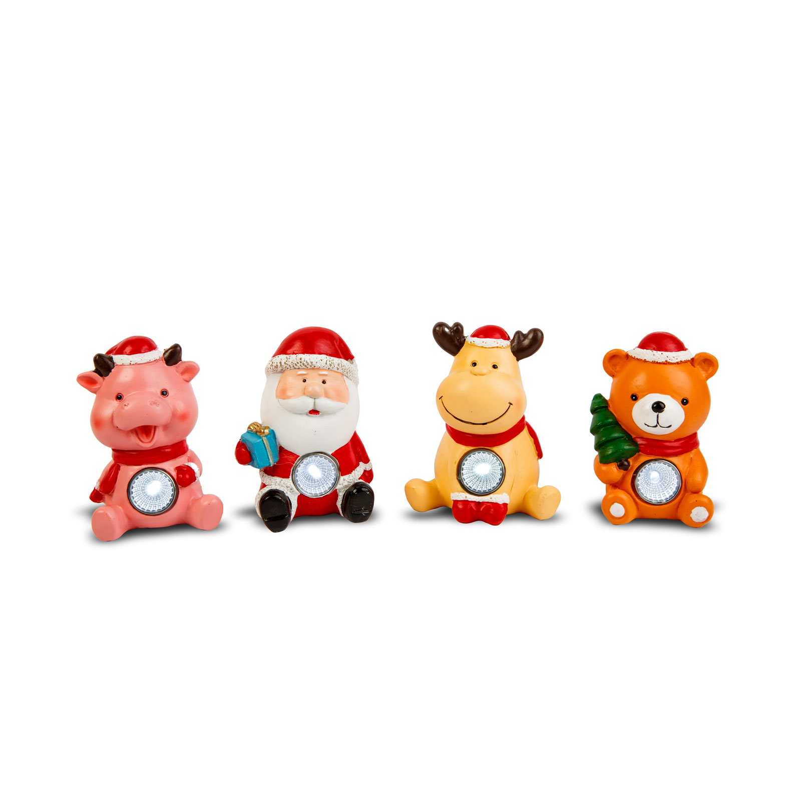 Hangulatos karácsonyi dekoráció, amely vidám figuráival mosolyt csal az arcokra! A szolár dekoráció hidegfehér LED-del világít, így ideális választás lehet ablakpárkányra, virágoskertbe, sziklakertbe. Négyféle aranyos forma érhető el: rénszarvas, maci, Mikulás és malac. Nappal feltöltődik az akkumulátor a beépített napelem segítségével, este automatikusan bekapcsol és világít.