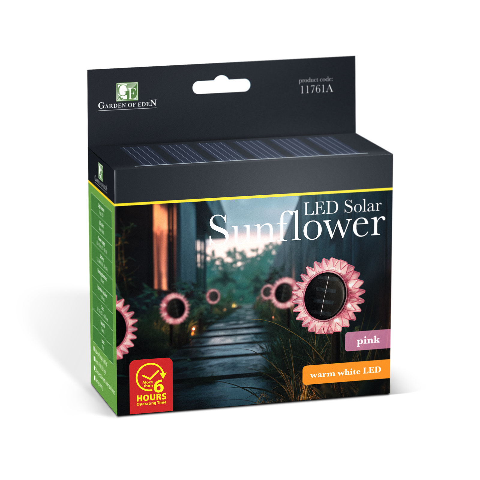 Ez a dekoratív szolár napraforgó lámpa hangulatossá varázsolja kertjét vagy teraszát. A többféleképpen rögzíthető kialakításnak köszönhetően leszúrhatóként és felakasztva is használható, így könnyedén illeszkedik bármilyen kültéri környezetbe. A beépített napelem napközben hatékonyan gyűjti a napfényt, melyből energiát biztosít az esti melegfehér LED világításhoz. A lámpa automatikusan kapcsol be sötétedés után, így nemcsak szép, de praktikus megoldás is a kert díszítésére.