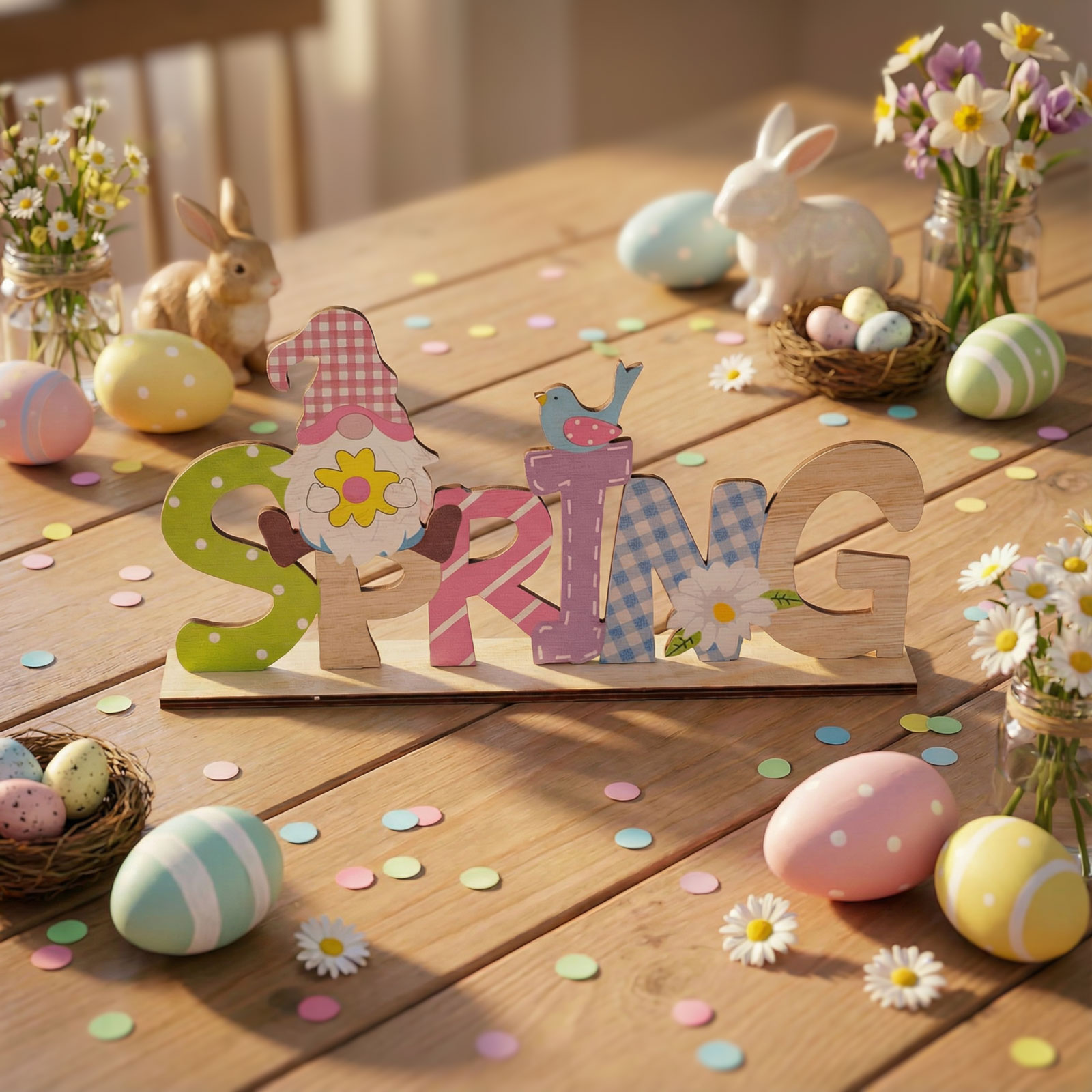 Dobja fel ünnepi asztalát ezzel a vidám, manós húsvéti dekorációval! A fából készült fekvő asztaldísz színes betűkkel formázza az „SPRING” feliratot, amelyet aranyos manó, kismadár és tavaszi virágok díszítenek. A dekoráció könnyedén elhelyezhető asztalon, polcon vagy komódon, és azonnal ünnepi hangulatot teremt otthonában. Tartós fa anyagának köszönhetően hosszú ideig megőrzi szépségét, így évről évre újra felhasználható.