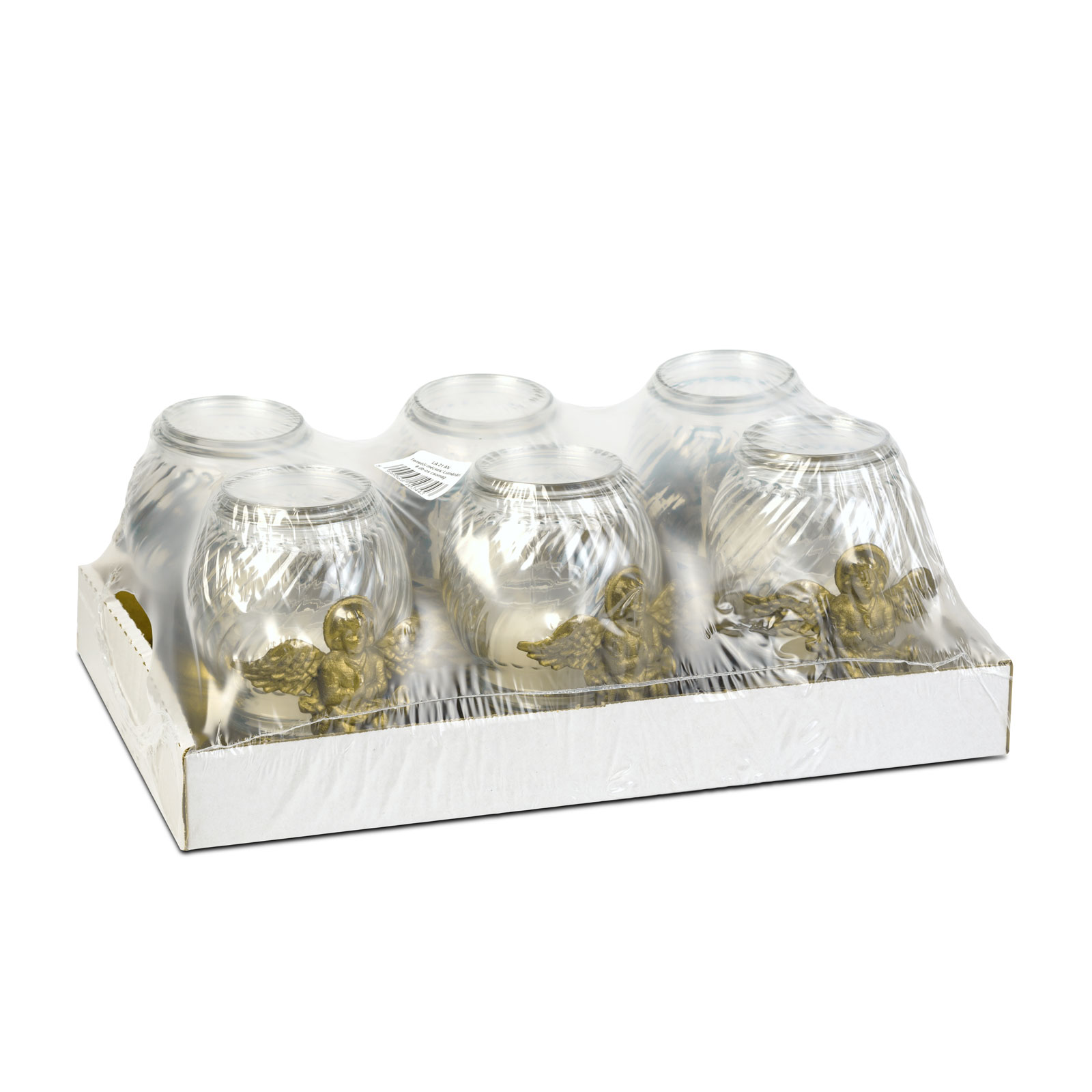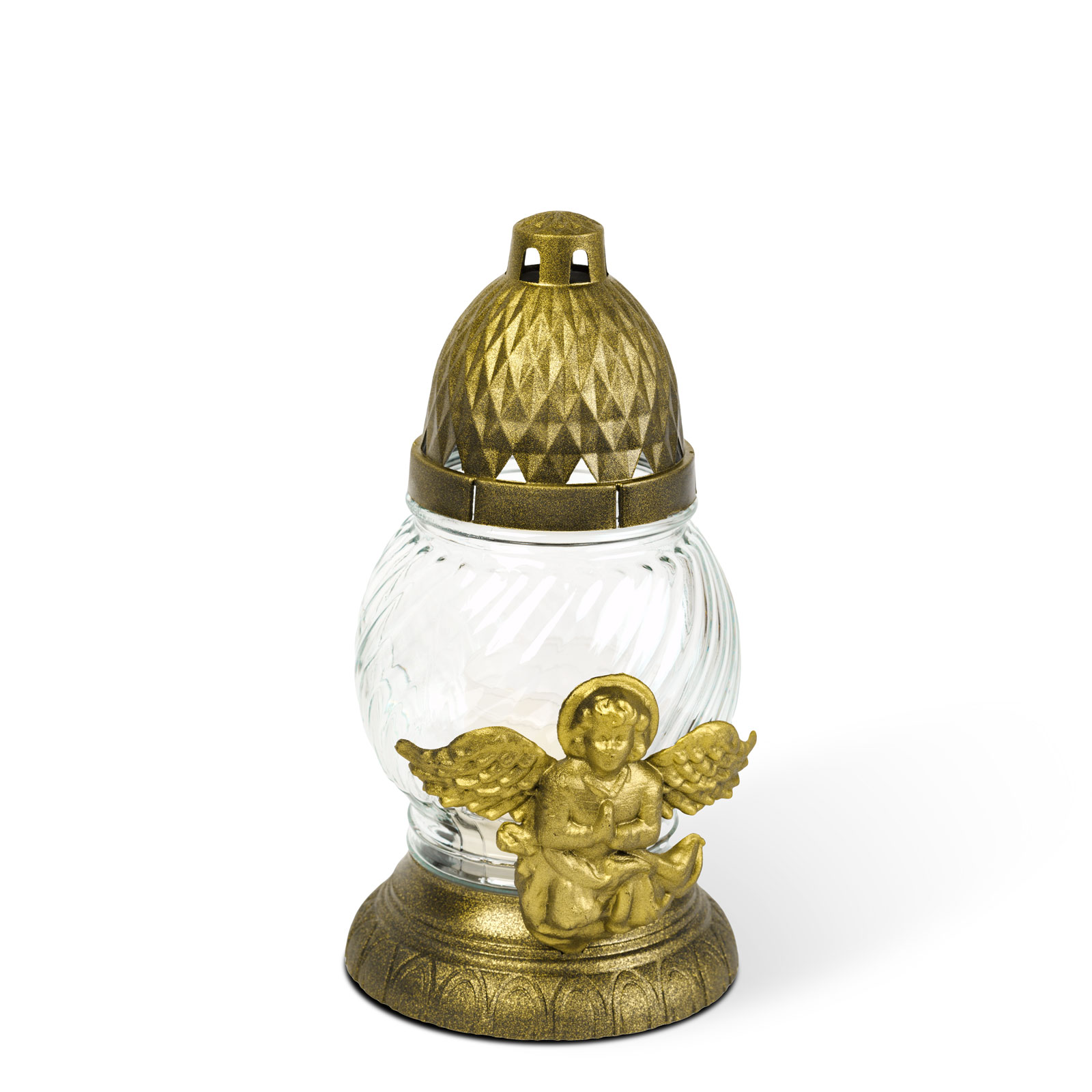 Üveg mécses – angyallal, műanyag kupakkal, üveg szín: fehér, kupak szín: fekete-arany antik – 20 cm
