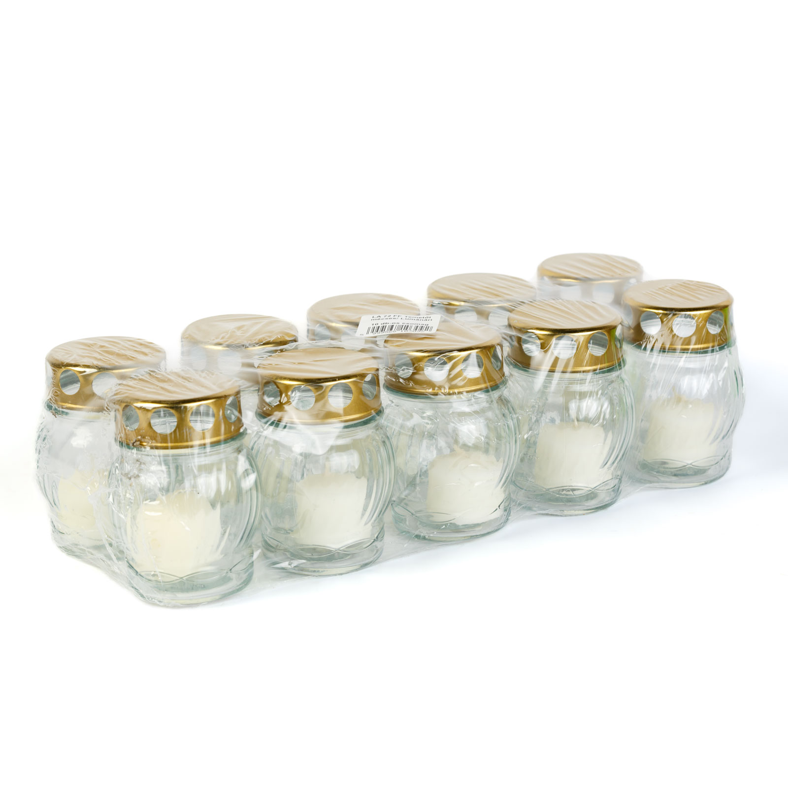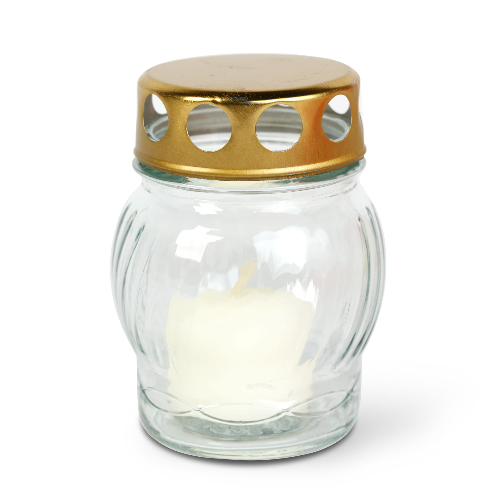 Üveg mécses fém kupakkal – üveg szín: fehér, kupak szín: arany – 10 cm
